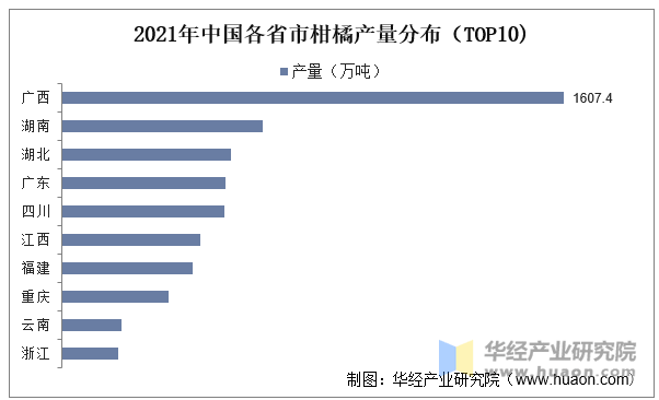2021年中国19个省级柑橘产区中,广西壮族自治区柑橘产量为1607。44万吨,正在全国柑橘产量中所占的比沉约为28。73%,位居全国第一位,取其他省域比拟劣势极为较着。湖南省柑橘产量为643。2万吨,正在位居全国第二位,所占的比沉约为11。49%,次于广西壮族自治区,湖北省柑橘产量位居全国第三位,正在全国所占的比沉约为9。67%。